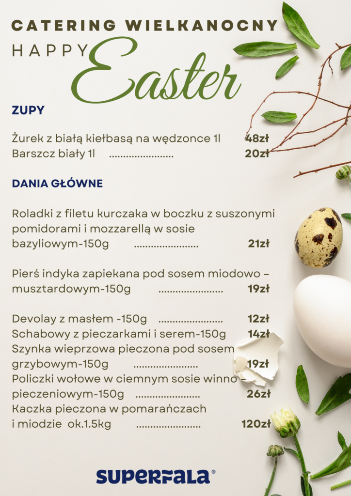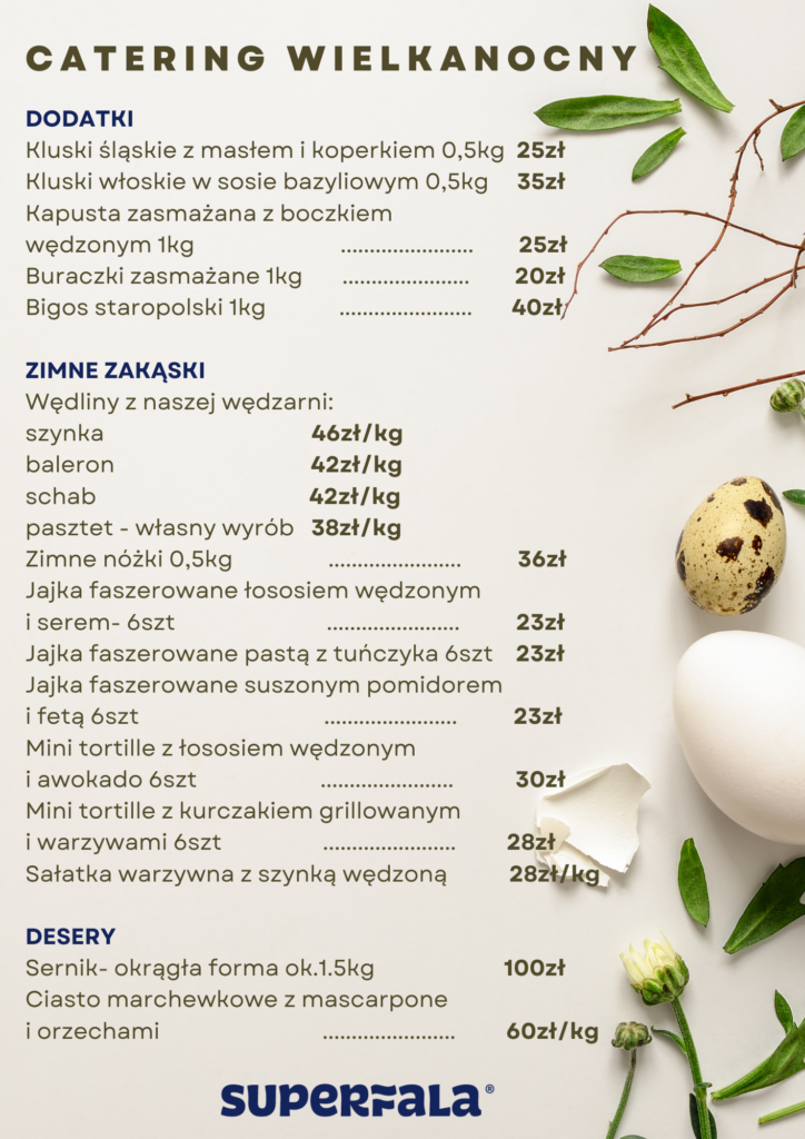 Jak co roku przed świętami wielkanocnymi, Restauracja Superfala przygotowała wyjątkową ofertę cateringu świątecznego. Mogą Państwo zamówić na swój stół nasze autorskie wypieki (w tym kremowy sernik) i – bestsellerowe wyroby z naszej wędzarni.