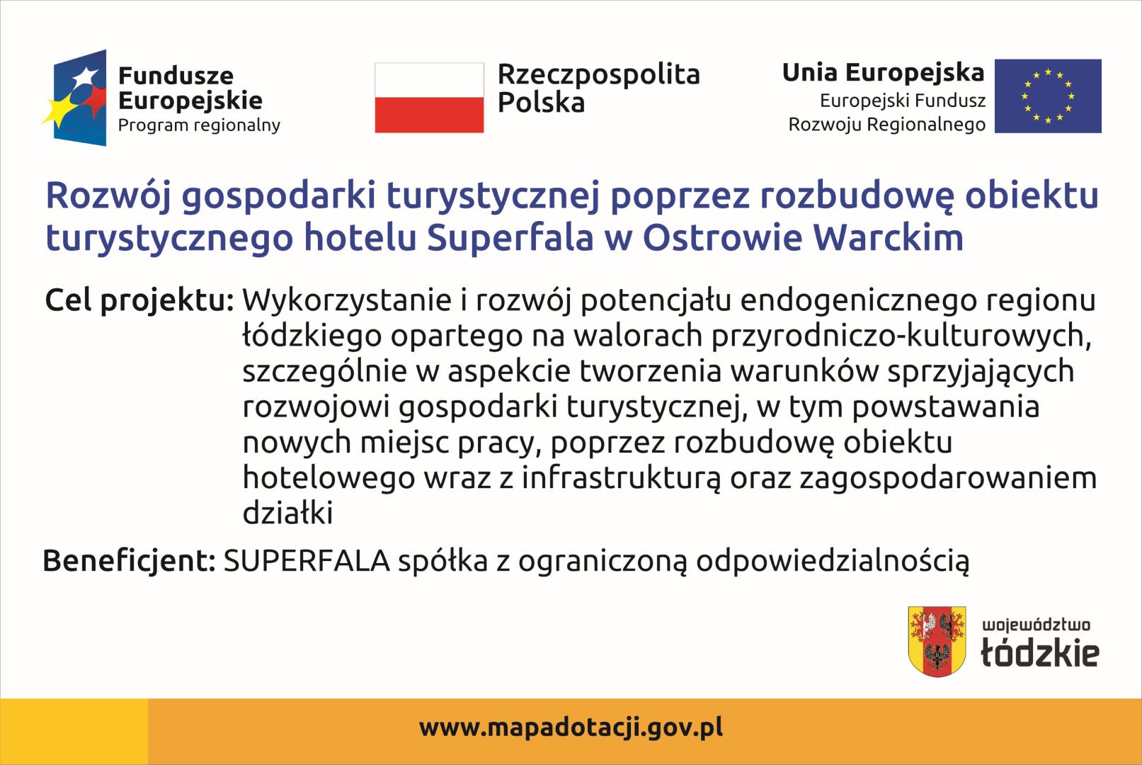 Projekt nr WND-RPLD.06.02.01-10-0030/20 pn.: „Rozwój gospodarki turystycznej poprzez rozbudowę obiektu turystycznego hotelu Superfala w Ostrowie Warckim” jest współfinansowany przez Unię Europejską z Europejskiego Funduszu Rozwoju Regionalnego w ramach Regionalnego Programu Operacyjnego Województwa Łódzkiego na lata 2014-2020